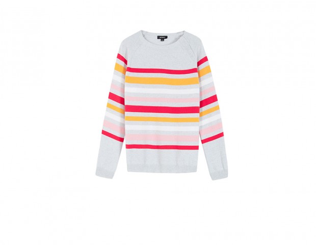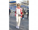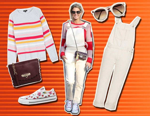 La blogger brasiliana invece del classico modello in denim blu, la preferisce bianca, con risvolto alla caviglia, e la abbina a un pullover di cotone dalle righe vivaci e un paio di romantiche sneakers a fiori. Una tracollina matelassé e occhiali da sole con lenti sfumate completano alla perfezione la sua mise colorata e originale.