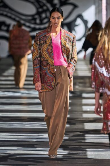 Prendete il mix by Etro coi pantaloni ampissimi color nocciola, il blazer a stampa paisley e il pull crop, o l’outfit di Tod’s col completo morbido e i mocassini. Oppure l’abbinata di Emporio Armani nei toni del cobalto. Rispetto ai Nineties, i volumi sono lievitati, i tagli sono ancora più comfy, gli abbinamenti sono più arditi. Lo insegna – tra le altre – l’influencer e modella olandese Linda Tol, con giacca e pantaloni che sembrano rubati al fidanzato, ballerine e borsina di Hermès.