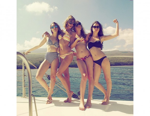 Pare che abbia cambiato idea ed eccola, ammiccante, in bikini con le amiche. Non dimentica però il suo aplomb fashion: il rossetto rosso e gli occhiali da diva infatti non mancano nemmeno in spiaggia!